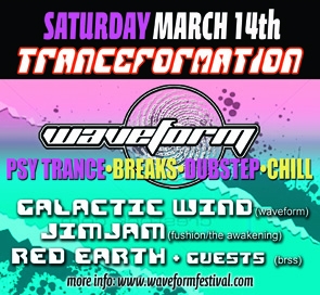 Title: Waveform presents Tranceformation Location: Assembly Rooms, Glastonbury Description: Another fun night of breaks and psy-trance. Start Time: 20:00 to later Date: 2009-04-18 DJs: JimJam (Fushion/The Awakening) Galactic Wind (Waveform) Red Earth + guests Sound by Fushion Sound System and Lighting by me, Dooza.
